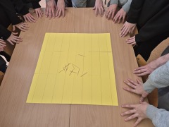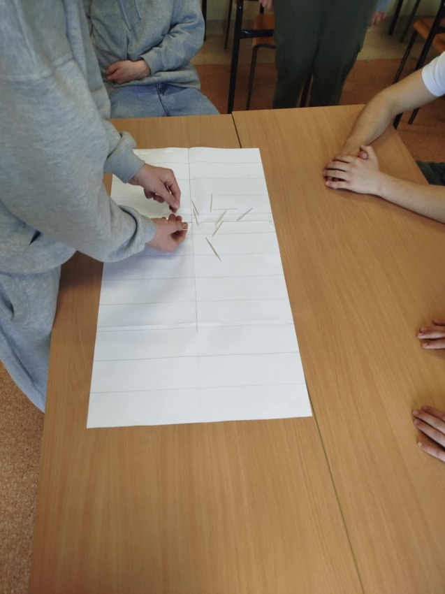Eksperyment polegał na rzucaniu igłą (u nas tę funkcję pełniły wykałaczki) na powierzchnię podzieloną równoległymi liniami o odstępach równych długości igły. Następnie zliczaliśmy, ile igieł spadło na linie. Więcej na temat Igły Buffona można przeczytać tutaj: https://pl.wikipedia.org/wiki/Ig%C5%82a_Buffona